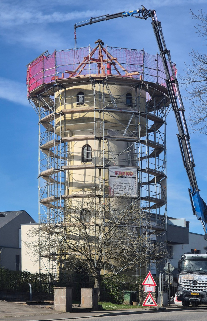 Eemolege Waassertuerm um Sennengerbierg D'Renovatioun vum eemolege Waassertuerm am Binnewee huet ugefaangen! Posted on 10. April 2026